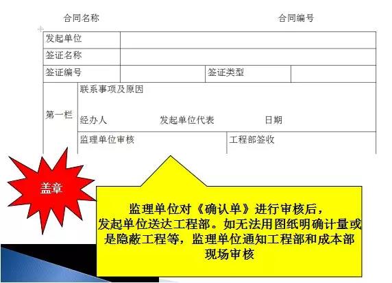 2、監(jiān)理單位對(duì)《確認(rèn)單》進(jìn)行審核后,發(fā)起單位送達(dá)項(xiàng)目公司工程部。如無法用圖紙明確計(jì)量或是隱蔽工程等,監(jiān)理單位通知工程部和成本部現(xiàn)場(chǎng)審核。